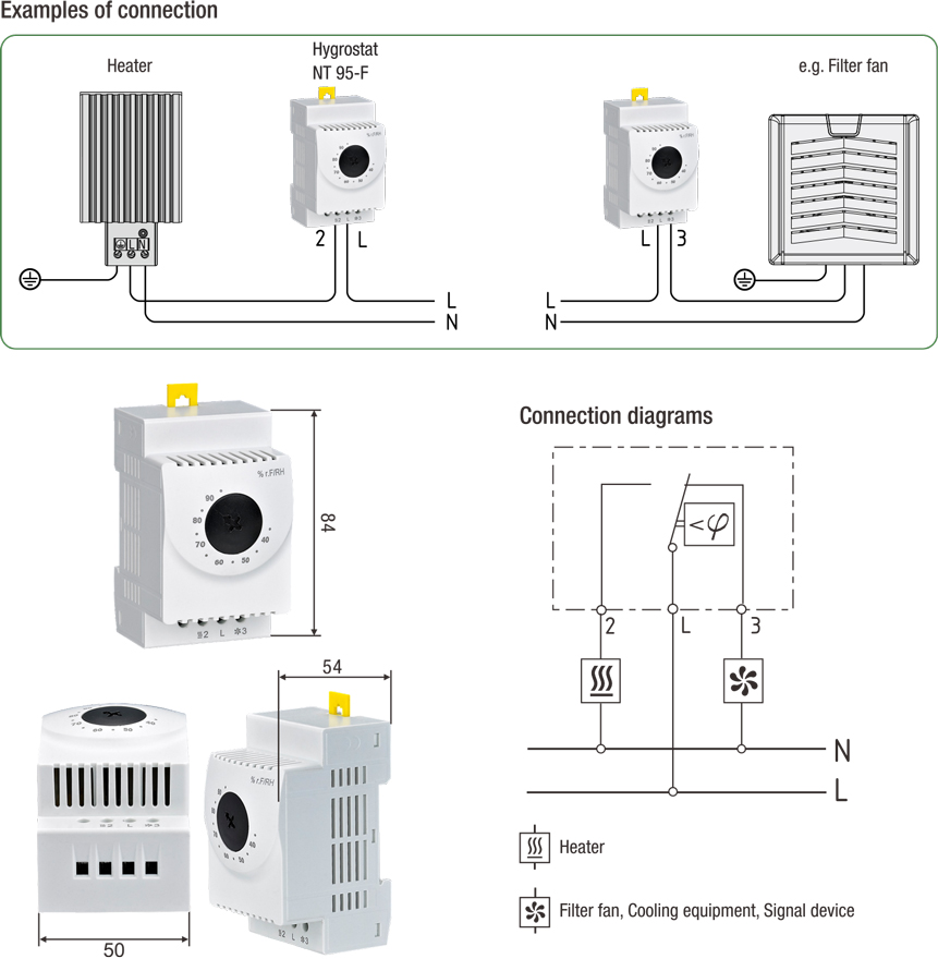 The electromechanical hygrostat is designed to control enclosure heaters so that the dew point is raised when a critical relative humidity of 65% is exceeded.Iin this way condensation and corrosion in enclosures with electric/electronic components is effectively prevented.