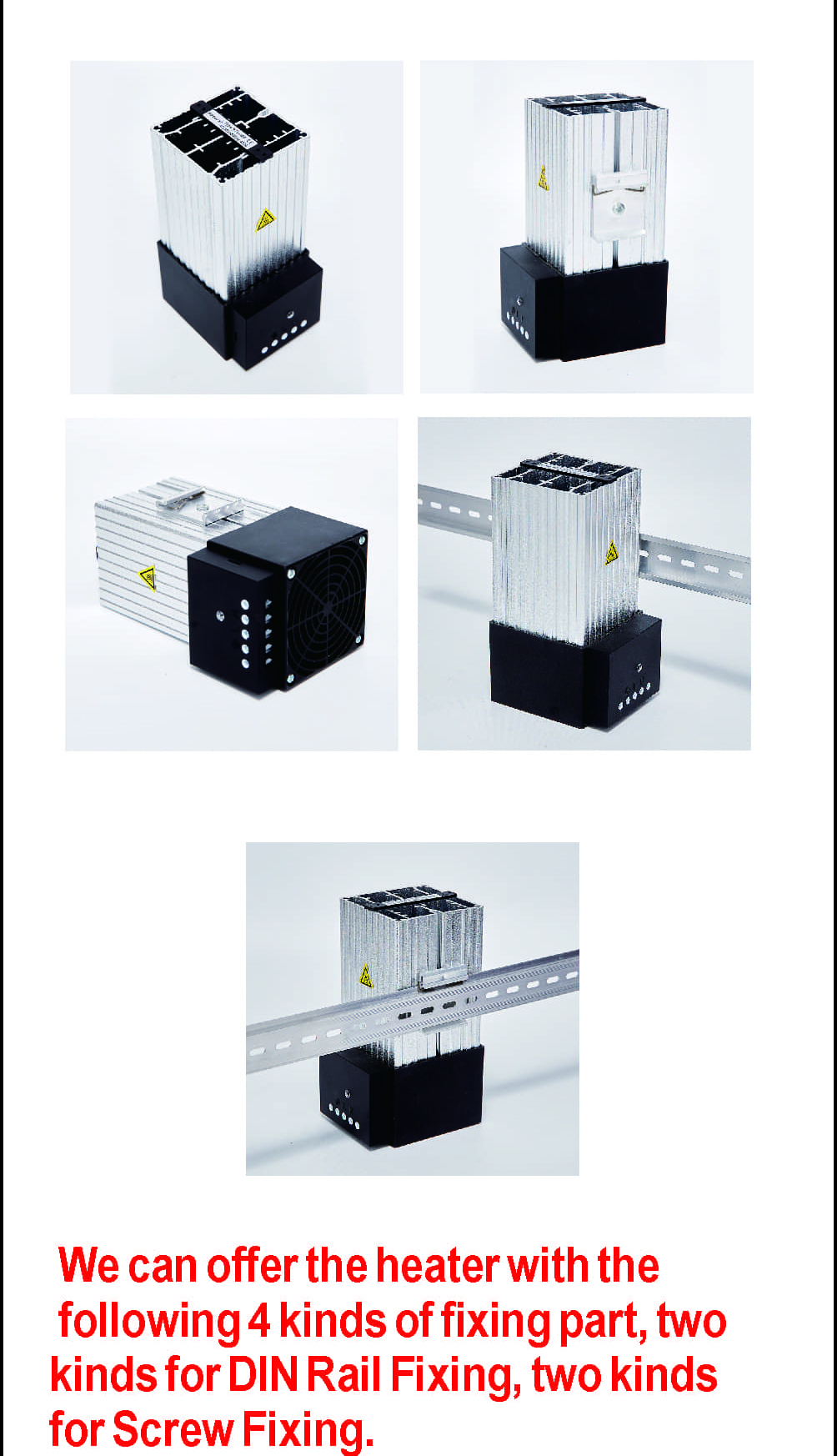 These heaters are used in enclosures where damage from condensation must be prevented, or where the temperature may not fall below a minimum value. The aluminium profile heater body design has a chimney effect and distributes the heat evenly. The heaters are designed for permanent operation. Pressure clamb connectors save time and simplify installation.