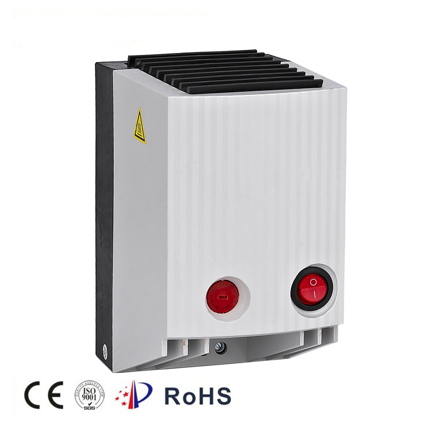 Semiconductor fan heater prevents formation of condensation and frost and provides an evenly distributed interior air temperature in enclosures with electric/electronic components. The integrated thermostat is used to set the desired temperature.