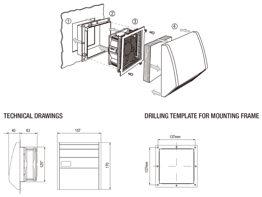 | Mounting frame | with double-sided industrial adhesive band for fixing to the outside of enclosure; certain operating circumstances can make the additional use of screws necessary (see drilling template); a template for the enclosure cut-out is included in the delivery of the filter fans |